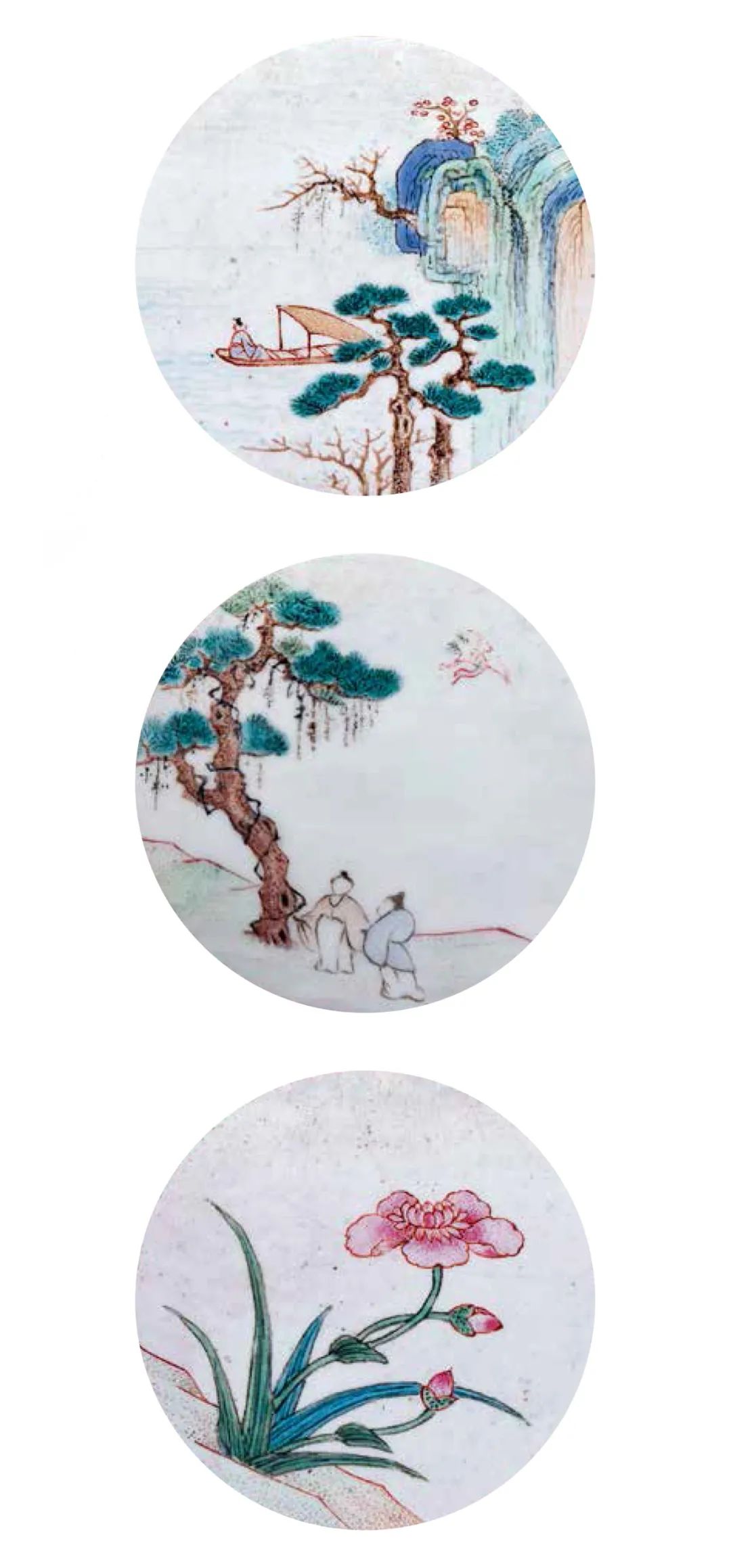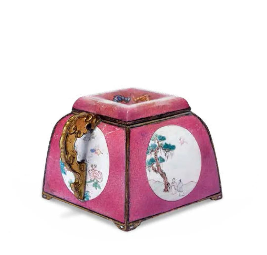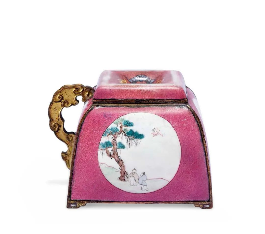 該件“乾隆銅胎畫琺瑯胭脂紅地開光山水花卉圖小壺”大小僅二寸見方,器形精巧別緻,以精銅為胎,胎體厚重,邊棱鎏金,燦爛奪目,壺身內口鑲接而成子母口式,與蓋相扣合。蓋中間內斂設一上寬下窄入水口,蓋口沿繪飾四隻蝙蝠。壺體、壺蓋內壁均施白色琺瑯彩,外壁以胭脂紅為地,釉色艷麗嬌嫩。壺體四面各設一圓形開光,內分別以白色琺瑯彩為地,繪製“松蔭高士圖”、“秋江泛舟圖”、“月季蝴蝶圖”和“蘭石圖”。 “松蔭高士圖”描繪奇山峻嶺中,虯枝長松高聳,風雨晴晦,兩位隱士立於松下,衣裳簡潔,似在攀談,空中仙鶴盤旋,翔姿靈活自在,有“松鶴延年”之祥瑞寓意;“秋江泛舟圖”中懸崖峭壁,危岩巨石,山勢險峻,崖邊秋樹盤出,近處蒼松並立,遒勁青翠。懸崖下清江一灣,碧波蕩漾,江水中小舟一葉,舟中一人作文士妝扮坐於船頭,雖只見背影,卻能感受到其高雅之氣質。遠處秋水共長天一色,境界十分清遠幽靜。全圖布勢爽朗,景緻開闊清曠,頗能傳達放舟江湖的空闊疏朗之意。 “月季蝴蝶圖”中,月季花盛開,花枝招展,吸引彩蝶繞飛,勃勃一片生機。而“蘭石圖”構圖簡潔,畫面清雅,頗有空谷幽蘭清幽之意境。整體畫工精細獨到,設色妍麗清雅,深淺濃淡過渡自然,工藝精湛無比,畫意頗有投乾隆帝之所好,當出自清宮琺瑯作良工精心之作。