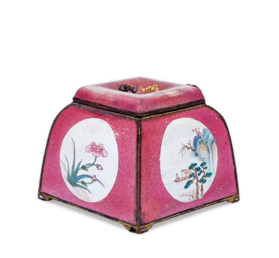 衆會(深圳)首拍│清乾隆 銅胎畫琺瑯胭脂紅地開光山水花卉圖小壺