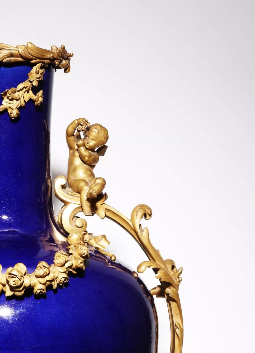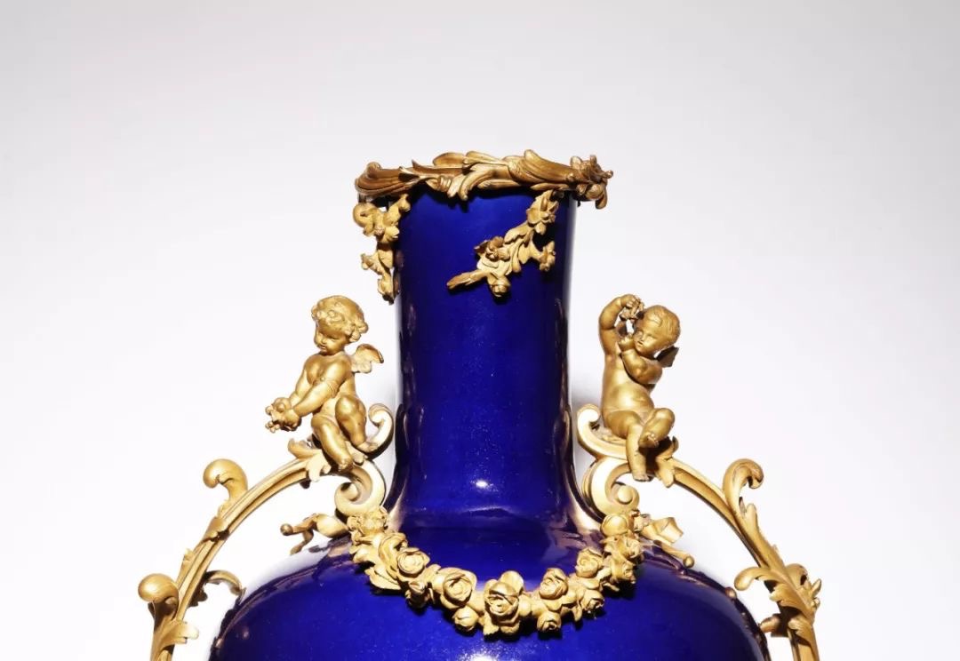 值得註意的是,本件作品外有銅鎏金底座,是路易十五時期,在龐巴杜爾侯爵夫人的支持和推動下洛可可風格形成,這種華麗誇張的裝飾、富麗堂皇且富於動感的藝術境界更趨於輕快、柔和以及甜賦典雅。柔美的波浪曲線,精致復雜的銅鎏金雕刻,悠揚的卷葉造型和頑皮的小天使,使宮廷藝術的洛可可風格受到國外眾多收藏家的青睞和喜愛。其精湛的雕刻無不展現出當年法國藝術家卓越的工藝創作靈感與藝術水平。此件作品的整體造型洋溢著高雅尊貴的藝術氣息,具有十八世紀法國宮廷特征。在天使的庇護下,似乎緩緩向世人敘述著中西結合的藝術巔峰之作。